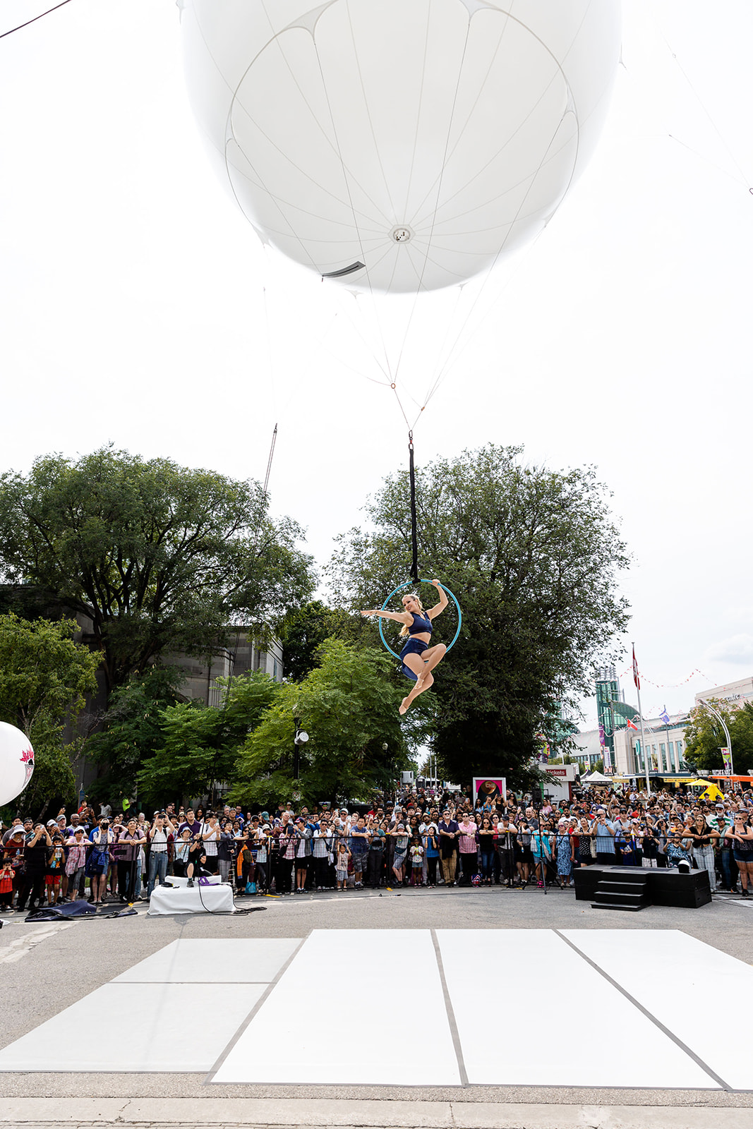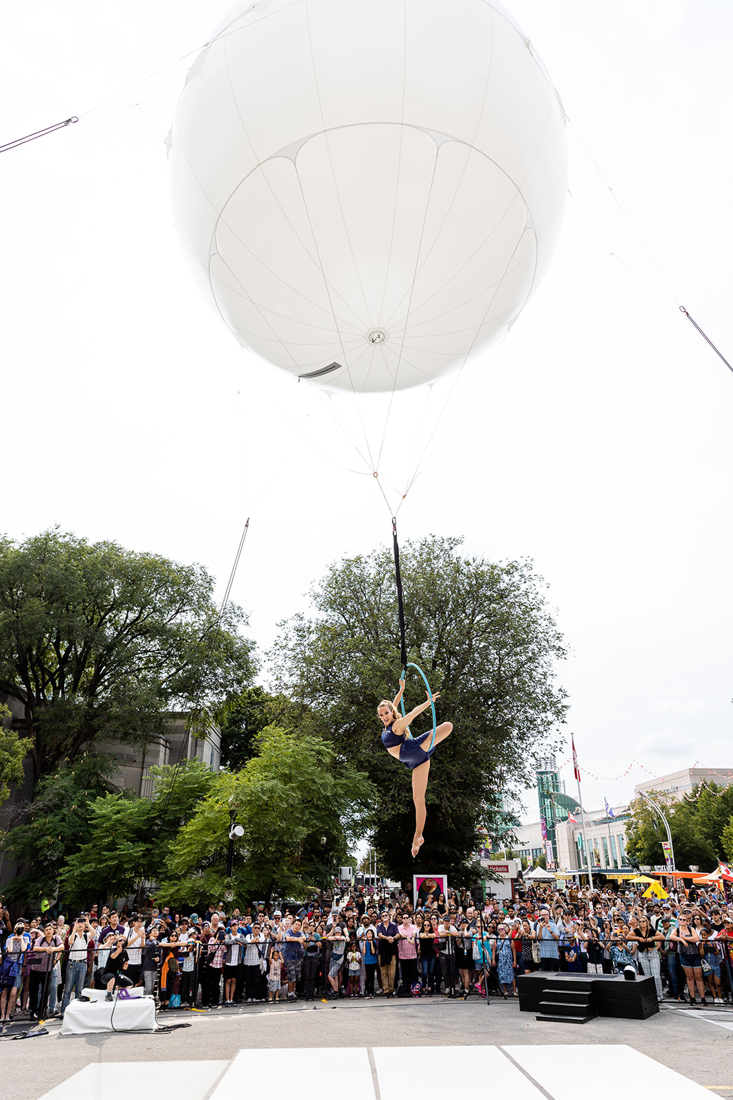This innovative setup not only mesmerizes audiences with the breathtaking performance of an aerialist suspended beneath a giant balloon but also offers a unique way to showcase sponsor logos and branding. Imagine your event’s branding projected onto the balloon as the aerialist performs stunning acrobatics below, creating a visually captivating experience that will leave a lasting impression on your audience.